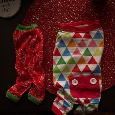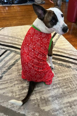 Accessorize your four-legged friend for Christmas with the Santa Dog and Cat Pajama from Wondershop™. These red pet pajamas feature an allover print of Santa's face and stars in white along with green leg openings for a festive look. Made of stretchy polyester, they feature a convenient pullover design and can be washed by hand after use.