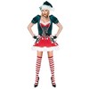 Feel fun and festive this holiday season with this sultry spin on the original elf costume. Our Ladies Santa's Helper Costume is the perfect choice for women who want to look glamourous this Christmas! After a hard day in the workshop, this outfit will get you in the festive spirit and ready to celebrate the most wonderful time of the year. The Ladies Santa's Helper Costume is made up of a mini dress with a puff red skirt that's trimmed with white fur. It also features a corset style lace up top with pom pom detailing, which is trimmed with candy cane stripes and frilly puffed sleeves. It also includes a belt, candy cane striped thigh highs, glovettes and a festive green elf hat. This is a fun, colourful and feisty take on an elf costume and is a great choice for a festive night out. Please note, the packaging for this product will display US sizing.