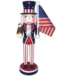 This 14" nutcracker is the ultimate Patriot. His jacket is painted blue with white stars and red lapels. His pants are red and white. He is holding the American flag in one hand and on his arm sits an Eagle. To complete his look his hat is blue with white stars and red and white stripes. This piece stands on a red, white and blue round base.