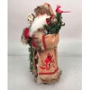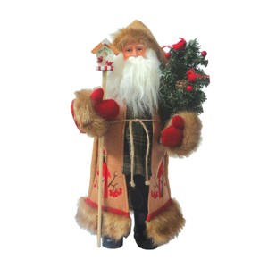 This adorable Santa is dressed in light tan coat with brown fur trim. His coat has a cardinal motif embroidered on it. He is holding a tree which is decorated with berries, cardinals and pine cones. He also has a stick with a birdhouse on the top.