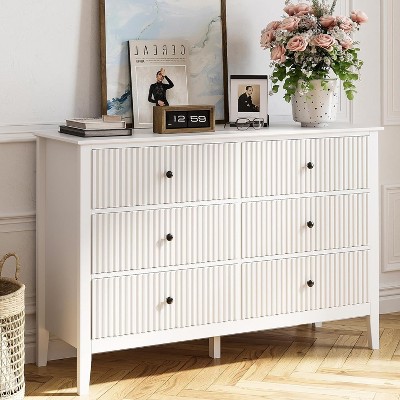 Sapphtopaz Modern Double Dresser with 6 Rattan Drawers, Wood Closet Storage with Alloy Ring Pulls for Entryway Versatile Dresser for Bedroom, Dark Oak
