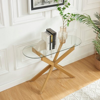 Sapphtopaz Modern Glass Console Table with Tempered Glass Top Sofa Table with Cross Metal Base Rectangle Entryway Table for Living Room,Hallway,Golden