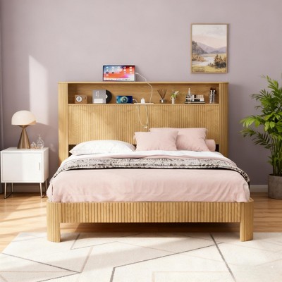 Sapphtopaz Retro Queen Bed Frame with Storage Headboard & Metal Support Wavy Curved Lines Wood Platform Bed with Charger Station for Bedroom, Natural