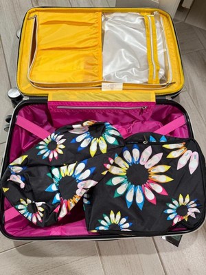 [This review was collected as part of a promotion.] This is my MOST favorite carry on suitcase I have ever owned!! Love Sarah Jessica Parker's line of products. The high heels design in the shape of flowers is just so freaking adorable! This suitcase is very well made. Already traveled with it and no dents, dings or scratches! I love the inside wet pouch pocket for bathing suits or hair/body products. Such a cute idea to include two smaller cosmetic bags with the same high heel design. I love all of the colors in this suitcase too! Very vibrant and eye-catching! Could not recommend this suitcase enough!! It also has a smaller zip pouch inside, a drawstring bag, a shoe area that zips up away from the clothing area. You can expand the suitcase if needed by unzipping the extra fabric. Also one of my favorite parts are the 360 wheels, so you don't have to worry about lifting the suitcase to maneuver differently. It moves with you whatever way you need it to!
