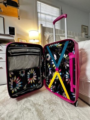 [This review was collected as part of a promotion.] I was supposed to be sent the teal one but instead, got the hot pink one. It is still a cute carryon. The hard shell seems sturdy enough to withstand it as a checked bag. The wheels are 360 and spins very easy. The adjustable handle doesn’t feel flimsy so you can carry another bag on top without worrying about it falling off. The inside interior has a very cute design. It even came with 3 storage bags for toiletries, dirty clothes, etc. There are also small zippered compartments. I love the bright color because it doesn’t blend in with most of the luggage you see.