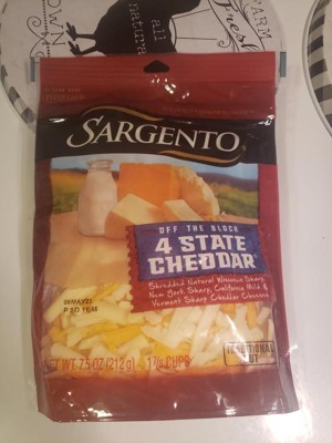 - This 7.5-oz package of Sargento® Shredded 4 State Cheddar® Cheese, Traditional Cut contains 1-7/8 cups of shredded cheese, great for everyday recipes