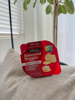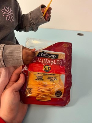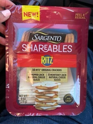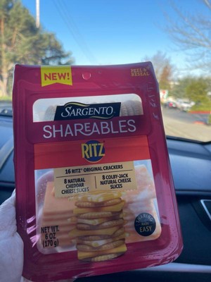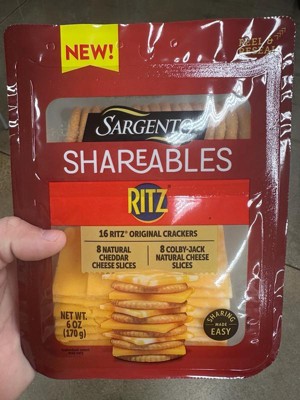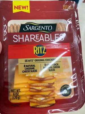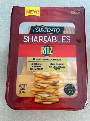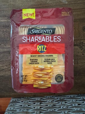 - This 6 oz (4 servings) Shareables pack contains 16 Ritz® Original Crackers, 8 cheddar natural cheese slices, and 8 Colby-Jack natural cheese slices