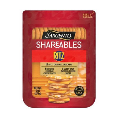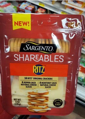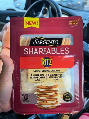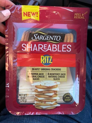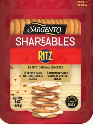 Introducing Sargento® Shareables with 16 Ritz® Original Crackers, 8 Pepper Jack Natural Cheese Slices, & 8 Monterey Jack Natural Cheese Slices, the ideal snack pack for sharing! This delicious duo combines 16 crunchy Ritz® Crackers with two varieties of Sargento® natural cheeses — 8 slices of spicy, creamy Pepper Jack and 8 slices of mild, tart Monterey Jack. The resealable tray helps ensure freshness, making it easy to enjoy anytime. Whether you're looking for a quick after-school bite or a simple appetizer for a gathering, this combo offers the perfect balance for easy sharing. For 3 generations, the Sargento family has proudly delivered high-quality, real, natural cheese you can trust. RITZ is a trademark of Mondelez International group, used under license.