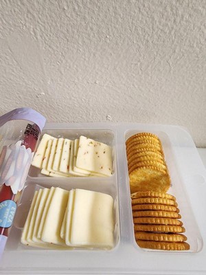 [This review was collected as part of a promotion.] Great cheese combo and it's already sliced which makes it very easy to top a Ritz cracker with. The package is resealable and has a good amount of adhesive on it so it resealable nicely. It also tastes very good. Each item is in its own compartment and stays fresh. The price is good for 16 slices of cheese and 16 crackers