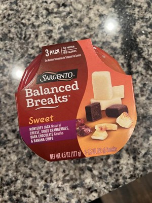 - Sargento® Sweet Balanced Breaks® snacks combine Monterey Jack Natural Cheese, dried fruit, dark chocolate chunks and banana chips, perfect when you’re on the go