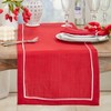 Boasting a vibrant color, this classic table runner creates the ideal foundation for crisp white dishware, chic silver flatware and elegant home accessories. Perfect for the holiday season or any other, the table runner is made with polyester and features a thin white frame around the edges that adds subtle dimension to your tablescape.