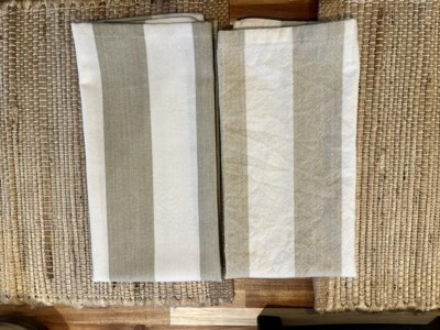 [This review was collected as part of a promotion.] The napkins are big! The cotton has a nice linen feel to it and love the clean line design in light taupe color just as I wanted. The napkins are sewed up and pressed nicely and neatly with no loose threads hanging out. They came out a bit wrinkly but quickly ironing was all they needed. Looks great on our table.