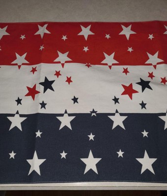 [This review was collected as part of a promotion.] I received the Star Spangled Runner. The size is 16" x 72". The colors are red, white and blue. The red is very vibrant but the blue is more of a dark denim color. The back is just plain white. The 100% cotton material feels nice and strong. And is sewen together well. There are stars sporadically all over the top. Some of the stars next to the white middle part however are part white and part colored. This is so the star that is on the edge is not cut off. It still looks good. Its slides a bit on my table but if i put something on top it stays better in place. Overall a good table runner.