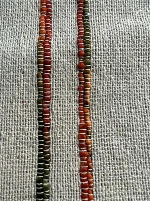 [This review was collected as part of a promotion.] The material on this Is a nice bright beige. It’s VERY a textured, more than what I thought on the picture. The material gives the runner a nice textured country style. The colored threading is all also thick and raised of the runner. It’s a bright red and orange thread… it looks really good and a nice contrast. The material on the runner is nice, it has a nice width and weight to it. It doesn’t bunch up on the table, nor does it wrinkle. It stays flat. It’s nice and wide and looks great on my mid century modern wood table.