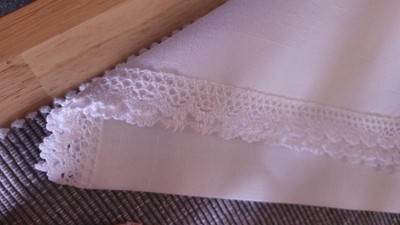 [This review was collected as part of a promotion.] These simple napkins remind me of a set my great aunt passed on to my mother, but with an updated fabric. The lace edge is neatly done and trims the edge beautifully. The fabric is washable and will take to cleaning. They're a good size to cover your lap easily. This is a great set.