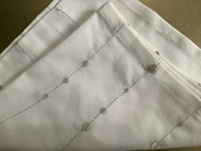 [This review was collected as part of a promotion.] These Saro Cotton Napkins with embroidered design is very pretty, simple yet elegant. They are 100% cotton and feels soft. The silver embroidery adds elegant to them. They seem well made and strong. They are easy to fold so can be folded in a fancy way or just roll them. They are white so will go with just about any decor and table setting. They would be great for a fancy dinner party, holiday dinner or everyday use if you wish. I like them very much.