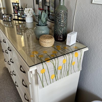 I love this runner. I actually bought 2 of them to drape over my plant table. Beautiful material. It looks so pretty. The yellow flowers really pop. It brightens up the room.