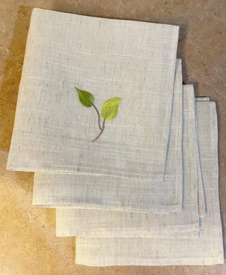 [This review was collected as part of a promotion.] These napkins are pretty and match my nature inspired decor, but the embroidery is slightly off of where I would like for it to be. I think it would have looked nicer if it were closer to the corner of the napkin. The fabric, color and design are perfect though.