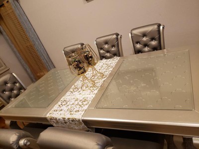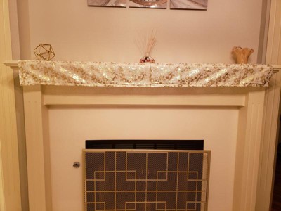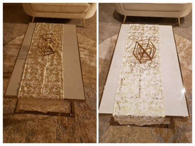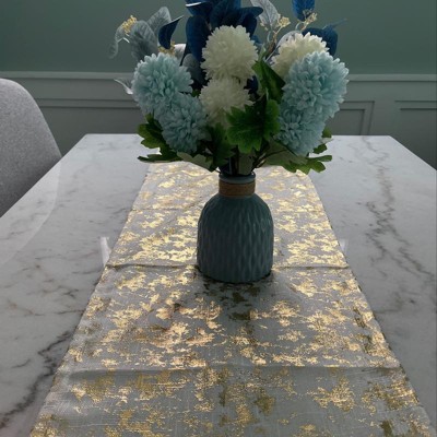 [This review was collected as part of a promotion.] Long Table Runner with Foil Print Design I love this table runner. Nice material, gorgeous texture, not to mention elegant. I love the many ways and on the different types of surfaces, I can use it. I placed it on my fireplace mantle, and it is stunning, on my dining table it sits gracefully, on my coffee table the runner brings the room together with gold accents. At night it has a radiant look and during the day it is glamourous. This Table runner compliment every room in my house. I absolutely love it.