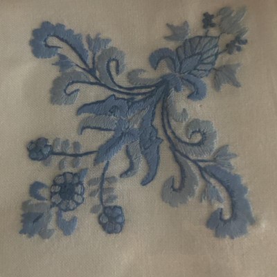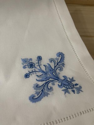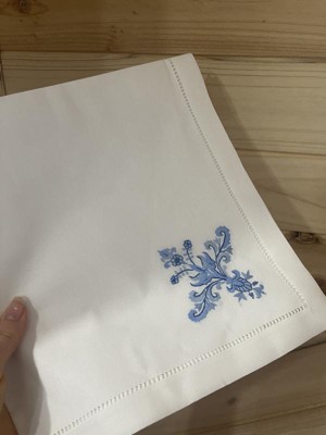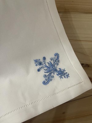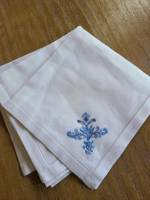 [This review was collected as part of a promotion.] These are beautiful table setting cotton napkins with blue embroidered design. Rather festive and elegant, these napkins will adorn various occasions. The craftsmanship is impeccable, and the cotton material is of the highest quality. The napkins are pleasant to use and are very soft and crisp-looking. The blue on white ornamental design is easy to match to various kitchen linens and settings. I highly recommend these napkins as they are truly beautiful and serve the purpose very well.
