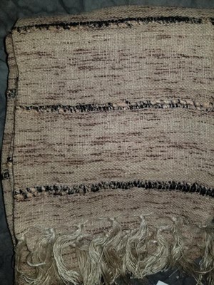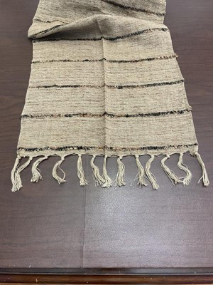 [This review was collected as part of a promotion.] This table runner is very nice. It is light weight with fringe on the edges. It is tan with dark brown and black lines running across it. It is simple yet pretty and goes with just about anything. It washes well also.
