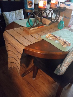 [This review was collected as part of a promotion.] I received the Saro Lifestyle Table Runner with Stripe Design throughout the runner. The runner is a nice long piece that can either go on a square, rectangle or round table as I have shown. It falls nicely on each side and have a earthy natural tone with a woven feel of a texture. In the dark brown stripes you can see different tones of brown stitching in there which is cool and a good blend. Also on each side of the runner there are 12 tassels that's bunched together along the bottom.