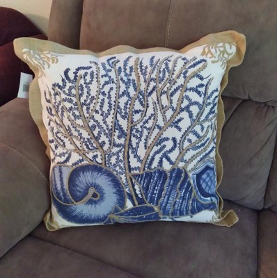 [This review was collected as part of a promotion.] I got this seashell throw pillow to complement the shades of blue, beige and white in my living room and dining room and it coordinates perfectly with the rest of my decor. It looks great on my beige couch. I love to decorate with nautical/beach-inspired touches during the summer, and this pillow fits right in with my theme. It is beautifully detailed, well made and high quality. I love the large seashell and coral images in shades of medium and dark blue and the fact that they are outlined and highlighted with a pretty beige jute-like rope to really make them stand out. I also love the coordinating burlap trim around the entire outer edge of the pillow. It is nice and plump, but it does have some give, and generally retains/regains its shape. I’m glad that it has a removable outer cover that I can just unzip and remove if it needs to be washed, and the zipper is well hidden under a flap of fabric on the back of the pillow. I would definitely recommend this pillow to anyone looking to add a beautiful beachy touch to their decor for the summer!