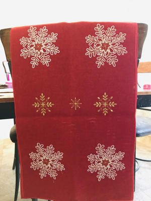 [This review was collected as part of a promotion.] This table runner is a beautiful deep red and is the perfect addition for decorating my dining room table for Christmas. The length works well for my large table and I love the gold sparkly thread they used in the snow flakes.