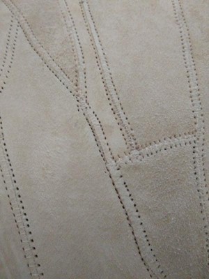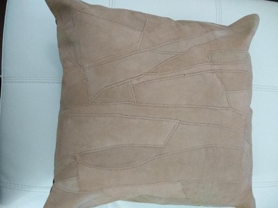 [This review was collected as part of a promotion.] This pillow has a very natural tone, as described. It's patched leather (suede) on one side and fabric on the back. The cover is removable, using the zipper opening on the back side. The cover is well constructed. The polyfill insert is nothing special and can be easily replaced if it goes flat with use.