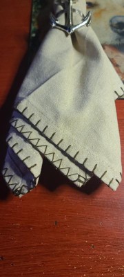 [This review was collected as part of a promotion.] I got these napkins to go with my Anchor Napkin holders for our beach house and I am very happy with the style and quality. The brown whip stitching around the edges gives an added touch, much nicer than plain cloth napkins. The napkins are a bit thicker material so they keep their shape and allow you to do more design wise with them. I have washed these napkins many times and they still look like new plus food stains come out easily and they need minimal ironing.