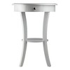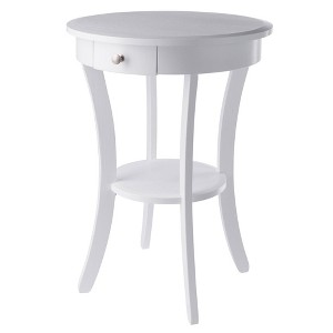 Add this charming Sasha Round Accent Table from Winsome to your living space for a refined look you'll love. Featuring a round tabletop and flared legs, this white side table has a unique, fanciful look, and the single drawer is finished with a metal drawer pull for a touch of extra detail. The built-in shelf is perfect for books or decor, and the wooden construction makes it strong and stable. Place it in your living room or den to create a curated look that displays your unique taste.