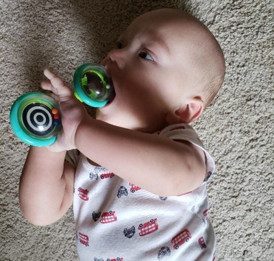 in the first few weeks, infants can only see high contrast black and white patterns like the ones around the mirror and on these soft rattles. My newborns were mesmerized with this toy in the first few months. As their eyesight developed, they were fascinated with their image. I loved this set so much that I've given it as gifts a number of times. Highly recommend.