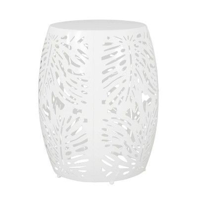 Effortlessly elevate your outdoor space with an eye-catching accent piece that also keeps your necessities at hand. With a sleek, modern barrel structure and hollow framework, this end table is an excellent sidekick to your existing outdoor furniture, perfect for holding a tray of snacks or a fresh pitcher of lemonade. The frame of this side table features an elegant iron cut design with a tropical palm leaf pattern, making this piece great for any area in need of something new.