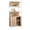 Feature the décor you want to display while hiding the items you don't, with this 5-shelf bookcase with doors. This versatile, open shelf bookcase provides efficient function and extensive storage simultaneously, with three spacious, open shelves that will make room for your vast selection of novels, binders, children's books, photos, collection of figurines, awards, trophies, or anything you could ever want to display. Meanwhile, this storage bookcase with doors provides a hidden area with an adjustable shelf allowing versatile space for any non-display items of all shapes and sizes. The back panels are removable and adjustable, allowing for the expression of your personal style. Finished in Kiln Acacia and paired with a durable white powder coated metal frame, the natural and neutral finish provides the versatility to fit in to any home décor. This metal and wood bookcase is the additional storage solution you've been needing.