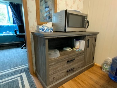 Needed a cabinet in the kitchen to hold our microwave and hot water pot. Used the drawer to hold kitchen linens. Perfect for the space.