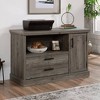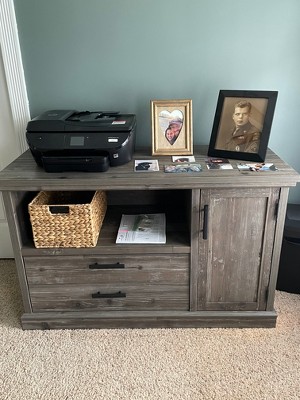 Versatility and style. That's what is offered with this file credenza from the Aspen Post collection. The top of this office file cabinet features a strong and lightweight 1 panel construction – meaning, it is perfect for your heavier home office essentials (like a printer) while remaining easy to assemble and rearrange. This office storage credenza features an adjustable shelf behind the right-side door. The adjustable shelf allows you to modify the file cabinet to customize the storage space to your specific needs. Versatile, beautiful, and personalized to your needs: what more could you ask for? Well, a file drawer would be helpful. This file credenza includes a file drawer with full extension slides to hold letter or legal-size hanging files. This keeps your documents organized and easy to find. We know your time is precious, so this office storage cabinet with drawer also offers quick and easy assembly with a T-lock drawer system which reduces assembly time. Finished in a distressed Pebble Pine and featuring attractive hardware, this file storage credenza is the perfect addition to your home office.