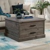The cool and neutral Pebble Pine finish of this storage coffee table from the Aspen Post collection will bring the feel of a rustic, mountainside resort directly into your living room, den, or family room. This coffee table with drawer features a durable and expansive surface for playing board games, coloring, snacking, and more. Featuring one large storage drawer with easy-to-use full extension slides, it's perfect for storing large items like a plush, fleece throw or pillows. Or use the drawer for smaller items like remotes, books, video games and controllers or movies. This living room coffee table is the perfect centerpiece for your lifestyle. This coffee table with storage drawer also has an open storage area with an adjustable shelf that provides a great spot to display family photos and treasures. To give you more time to enjoy the furniture, the slide-on moldings and T-lock drawer system make assembly quicker and easier. A coffee table with open storage, like this one, provides function and welcoming character to your living room, basement, or any setting.