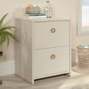 A stylish solution for your office organization has arrived. Elevate your home workspace with the Grand Coast® collection's lateral filing cabinet. This modern lateral file cabinet offers ample storage with full extension slides for letter or legal-size hanging files, ensuring a designated spot for all your vital documents. Safety is paramount with our patented interlocking mechanism, allowing only one drawer to open at a time. The drawers of this coastal filing cabinet feature a circular burst of bronzed hardware, adding a unique touch of style. The sturdy 1" thick top panel construction of this legal-size file cabinet provides a reliable surface to showcase decorative plants, a wireless printer, work binders, and cherished family photos. Finished in warm and natural Dove Linen™, with its delicate woven fabric detail, this handsome 2-drawer file cabinet will transform your workspace, bringing order, sophistication, and a touch of seaside serenity to your home office!
