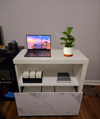 Need a solution for your office clutter and chaos? This lateral file cabinet with shelf from the Hudson Court® collection offers storage and style, all in one. This lateral filing cabinet features cubbyhole storage so you can stash and store your mail, important papers, or office supplies. This contemporary filing cabinet also features a file drawer with full extension slides that holds letter or legal-size hanging files. The top and side panel features strong and lightweight 2" construction, making it easy to put together and rearrange in your home. Use the top surface of this legal-size filing cabinet for displaying a lamp, photos of your family, home décor, and more. An enclosed back with cord access makes it convenient to charge your phone or laptop, plug in your printer, or your Bluetooth speaker. Finished on all sides for versatile placement, this 1-drawer filing cabinet will look polished from all angles. A Pearl Oak™ finish with faux White Marble accents gives this file cabinet a clean and sleek look for any home office.