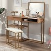 Get organized and improve your everyday routine with this bedroom vanity from the International Lux® collection. This makeup vanity with mirror is loaded with amenities – all designed for convenience and functionality. It includes a mirror that tilts, so you are always viewing at the perfect angle when applying lipstick, doing a skincare routine, or curling hair. This vanity with bench included has a cushioned seat and powder coated metal frame. A good bedroom vanity with storage, like this one, has hidden and open options. A drawer with metal runners and safety stops is perfect for items like eye shadow palettes, makeup brushes, and tubes of mascara. The cubbyhole area provides easy access to facial creams, hair styling products, or fragrances. Two open shelves (with one adjustable) provide flexible storage options for larger items like hair spray, lotions, curling iron, blow dryer, or candles too. This contemporary bedroom vanity has plenty of extra space on the top surface too. Finished in Sindoori Mango® with a powder coated metal frame for durability, this bedroom vanity provides everything needed to get your day started right.