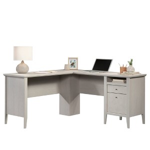 A casual and natural upgrade to any home office – the L-shaped desk from the Larkin Ledge® collection features simple forms and a clean finish with plenty of desk space. This home office L-shaped desk features a spacious top surface area, large enough to hold your monitor or laptop, keyboard, lamp, framed photos of family, and your cup of coffee. The upper storage drawer features metal runners and safety stops, making it easy to house your pens, pencils, stapler, and tape dispenser. This L-shaped desk with storage also includes a large file drawer with full extension slides. It holds letter-size hanging files to keep important files close at hand. This L-shaped desk with drawers includes an open cubby shelf for additional storage of your planner, folders, and more. Keep your desk free of cord clutter! A desktop grommet hole allows for channeling cords to keep your workspace tidy. This desk with open shelf is finished on all sides for versatile placement, meaning it will look great from every angle. With a Glacier Oak® finish, this L-shaped desk will help you forget you are working.