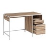 A light and airy aesthetic keeps a home office fresh and the ideas flowing. This home office desk with drawers from the Nova Loft® collection is stylish and storage friendly. This metal and wood desk features a spacious tabletop that provides you with room for all your office essentials – a computer monitor or laptop, your cup of pens and pencils, and colorful sticky notes. This pedestal desk features a small drawer with metal runners and safety stops for a stapler, planner, and other things you need to keep stowed away. The small storage cubby beneath the top surface offers a space for office supplies you want out of the way but close at hand. The lower drawer opens on full extension slides and holds letter-size hanging files. This home office desk with storage is finished on all sides for versatile placement in any room of your home. The finishing touch of a powder coated metal frame sets this desk apart. Finished in a Kiln Acacia™, this practical computer desk with shelving is just what you need to get the job done.
