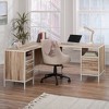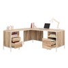Tackle all your big projects with renewed motivation and inspiration with the addition of this L-shaped desk with drawers from the Nova Loft® collection. One simple piece will give your home office a touch of modern style coupled with glorious organization. Two spacious storage drawers feature metal runners and safety stops. An additional larger drawer has full extension slides, and it will hold letter-size hanging files for additional organization. Above each drawer are two open shelves for additional storage of office supplies such as envelopes or paper, making this small office desk ideal for any size space. The spacious, L-configuration provides plenty of room for a computer, office supplies, and files. The Nova Loft L-shaped desk is finished on all sides for versatile placement anywhere in your home, featuring the Kiln Acacia® finish. This home office desk has a beautiful woodgrain look that is a neutral canvas to fit in with any interior design. With a durable, white powder coated metal frame, this metal and wood desk will provide your home office with years and years of stylish organization and productivity.