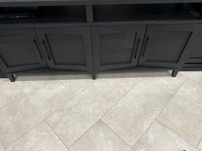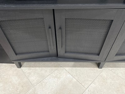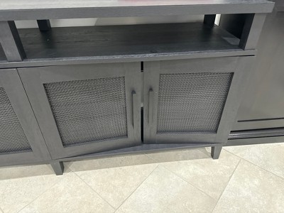 If you have a big TV and you're looking to make a big statement, this entertainment credenza from the Tiffin Line® collection adds effortless charm to any room. This TV credenza with doors can accommodate up to a 65" TV weighing 95 lbs. or less or can be used as a credenza for additional storage if a TV stand is not one of your needs. Underneath the top surface is a large shelving area for storage and display of electronic components, stacks of CDs or DVDs, framed photos, or other home décor. There is plenty of hidden storage too! Behind each set of doors is an adjustable shelf for flexible hideaway storage of other home essentials. This TV stand with doors includes decorative rattan inserts on the framed doors. In addition, the enclosed back panel of this credenza TV stand has pass-throughs for cord management. Finished in Raven Oak® and accompanied with black door handles and tapered feet at the base, this TV cabinet with doors exudes a bold but casual vibe in any living room, basement, or family room setting.