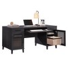 Looking for a little inspiration when it comes to staying organized and working on big projects? We've got it covered with this bold, do-it-all executive desk from the Tiffin Line® collection. Add casual charm and enhanced function with a home office desk featuring stylish door fronts with rattan inserts, two storage drawers with full extension slides, and a centered flip-down panel that reveals a slide-out keyboard/mouse shelf. Storage behind the doors includes an adjustable shelf and pull-out hanging file storage gliders that hold letter or legal size hanging files. Keep those important files close at hand. This desk with keyboard shelf includes a cord management system with two desktop grommets and cord pass-throughs. To ensure durability, this double pedestal desk has impact resistant, high-grade thermoplastic edges and meets BIFMA testing standards. It also accommodates optional Hidden Wireless Qi Charger by Eggtronics 425905 (sold separately – visit sauder.com for more information). Finished on all sides in a dark Raven Oak®, this executive desk with drawers is the office solution that not only looks good but performs too.