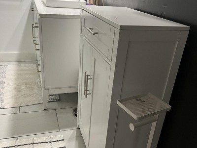 - Two adjustable and removable bathroom shelves, each with a 15lb weight limit