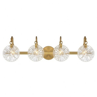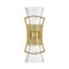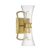 This Savoy House Bennington 2-light sconce features pleasantly curving shapes that combine to create an intriguing lighting look. Fluted clear glass shades and thoughtful detailing on the structure, finished in warm brass, gives the impression of motion. Bennington is 15" in height, 6.25" in width and extends 6.50" from the wall. It uses two candelabra size bulbs of up to 60 watts per bulb (bulbs not included).
