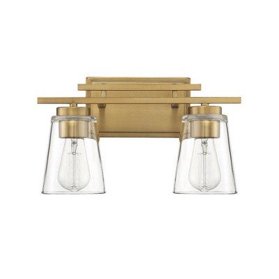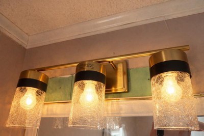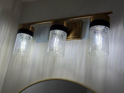 From top to bottom, the Savoy House Brickell 3-light bath vanity light is designed to make any bathroom a standout space. Its classic pairing of warm brass and black is made even better with the addition of textural clear crackled glass shades. Brickell is 8.75" in height, 22" in width and extends 5" from the wall. It uses 3 standard size bulbs of up to 60 watts per bulb (bulbs not included).