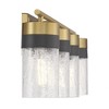 From top to bottom, the Savoy House Brickell 4-light bath vanity light is designed to make any bathroom a standout space. Its classic pairing of warm brass and black is made even better with the addition of textural clear crackled glass shades. Brickell is 8.75" in height, 30" in width and extends 5" from the wall. It uses 4 standard size bulbs of up to 60 watts per bulb (bulbs not included).