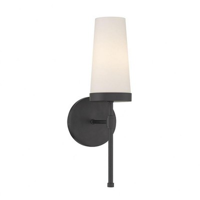 The Savoy House Brody 1-light sconce is a great way to infuse your home with sophisticated lighting style. Its streamlined classic look is decorated with a white fabric shade and finished in matte black with bold warm brass accents. It's perfect for brightening up any room! Brody is 16" in height, 5.75" in width and extends 8" from the wall. It uses a candelabra size bulb with a max of 60 watts. Damp area rated.